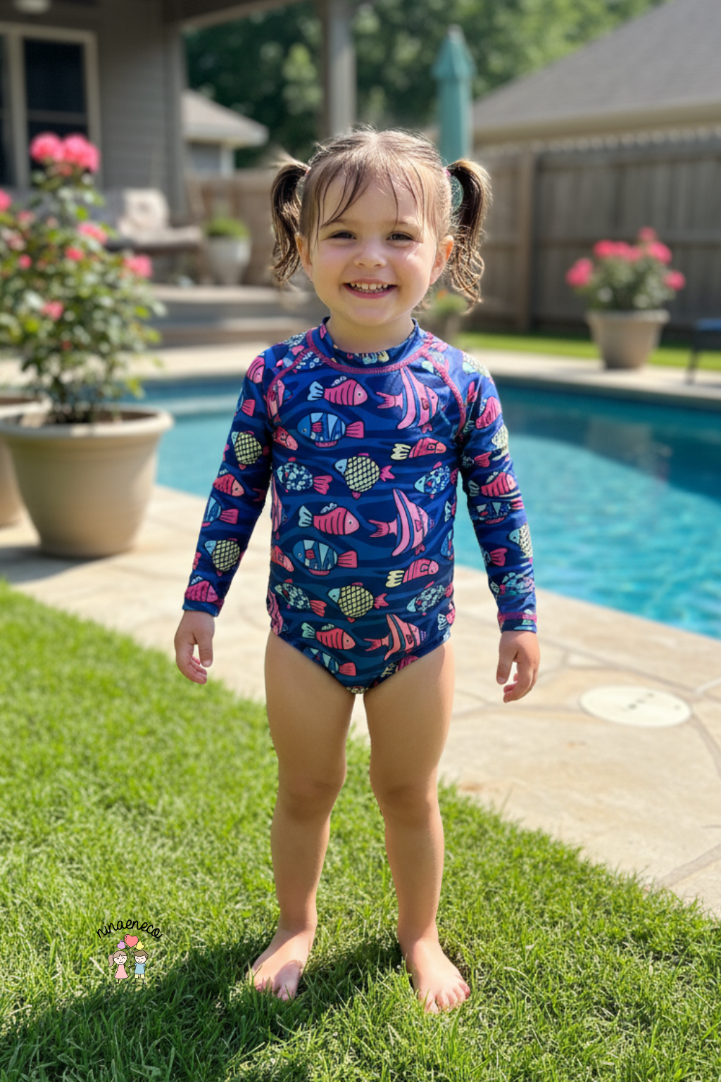 O Body Praia Manga Longa Menina Peixes Tip Top UV50+ oferece proteção solar avançada e visual muito divertido! O tecido tecnológico com elastano proporciona ajuste perfeito, conforto e liberdade de movimentos, enquanto a manga longa cobre braços e tronco, protegendo as áreas mais sensíveis dos raios solares. Estampa lúdica e exclusiva de peixinhos coloridos, ideal para compor looks alegres nos dias de praia ou piscina.