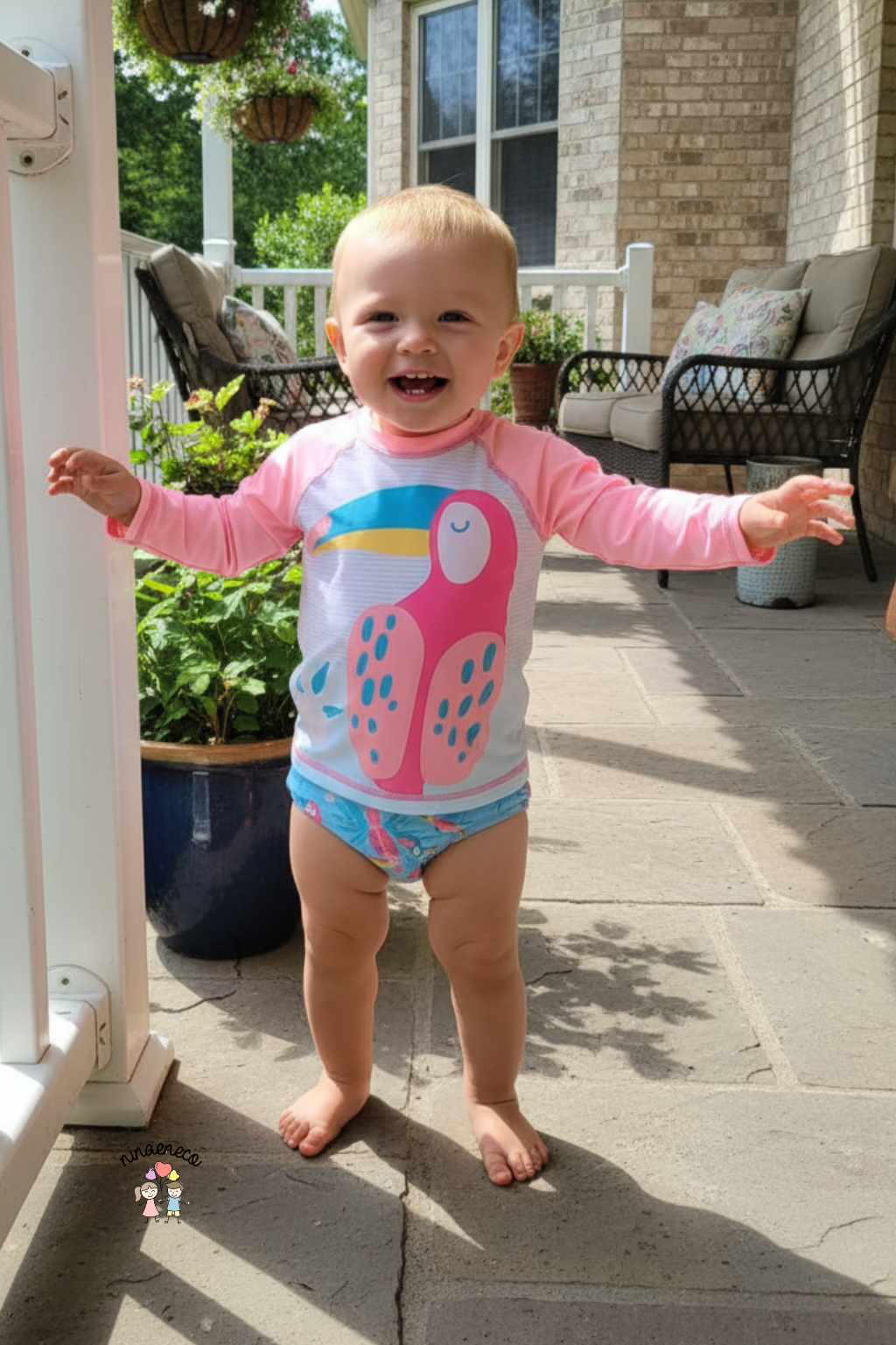 O conjunto conta com blusa de manga longa rosa com estampa divertida de tucano, que cobre bem os bracinhos e tronco sem perder o conforto. A calcinha acompanha a mesma identidade divertida, trazendo ajuste perfeito ao corpo e forro macio que não irrita a pele sensível da criança. Tecido leve, seca rápido, fácil de vestir e não limita os movimentos.