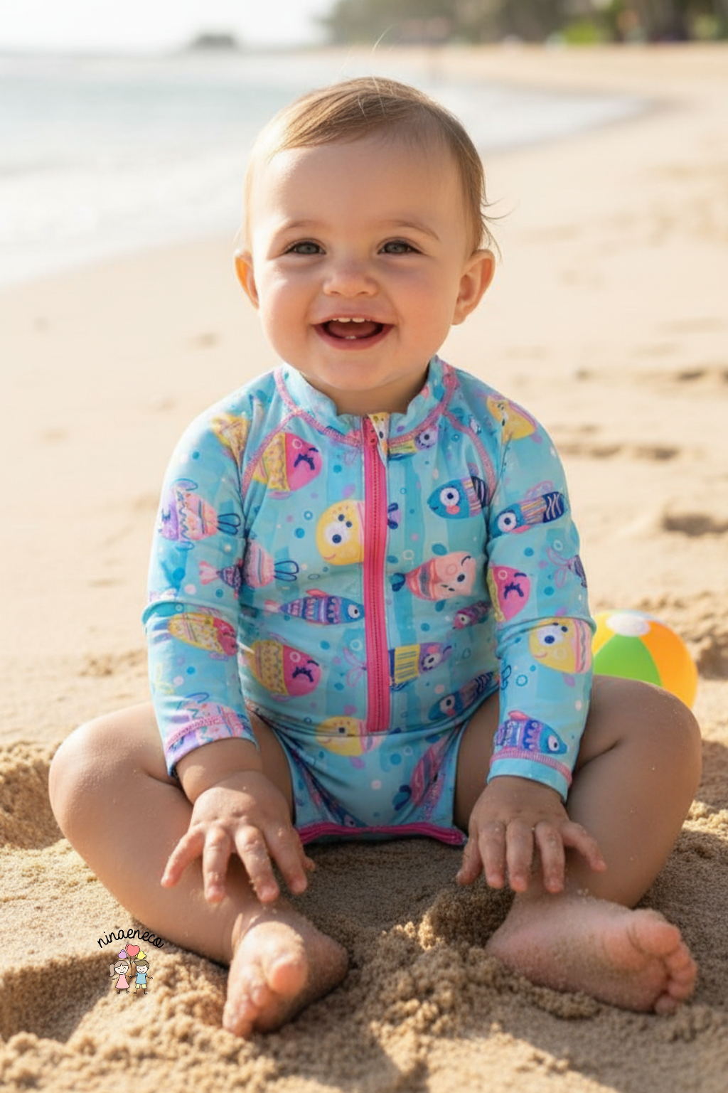 A modelagem cobre o tronco, braços e parte superior das pernas, protegendo áreas delicadas contra raios solares e evitando desconfortos com areia. O fechamento por zíper frontal facilita vestir e tirar, tornando prático para as trocas rápidas. Estampa vibrante e exclusiva de peixinhos, ideal para meninas que amam um visual colorido e alegre.