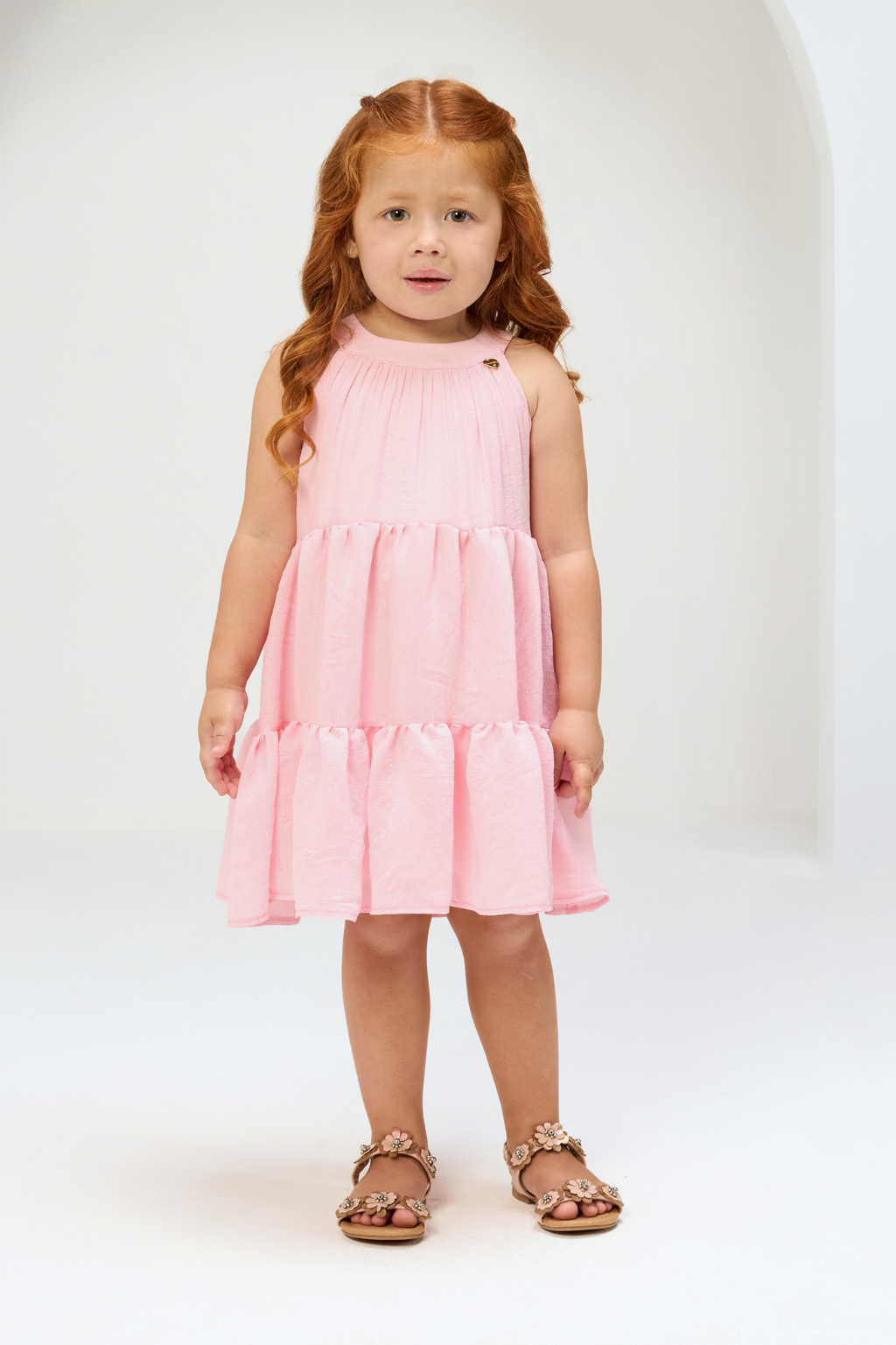 O design regata com pala franzida traz um ar romântico, enquanto a cor rosa pastel harmoniza com todos os tons de pele e facilita combinações para festas, aniversários ou passeios especiais.